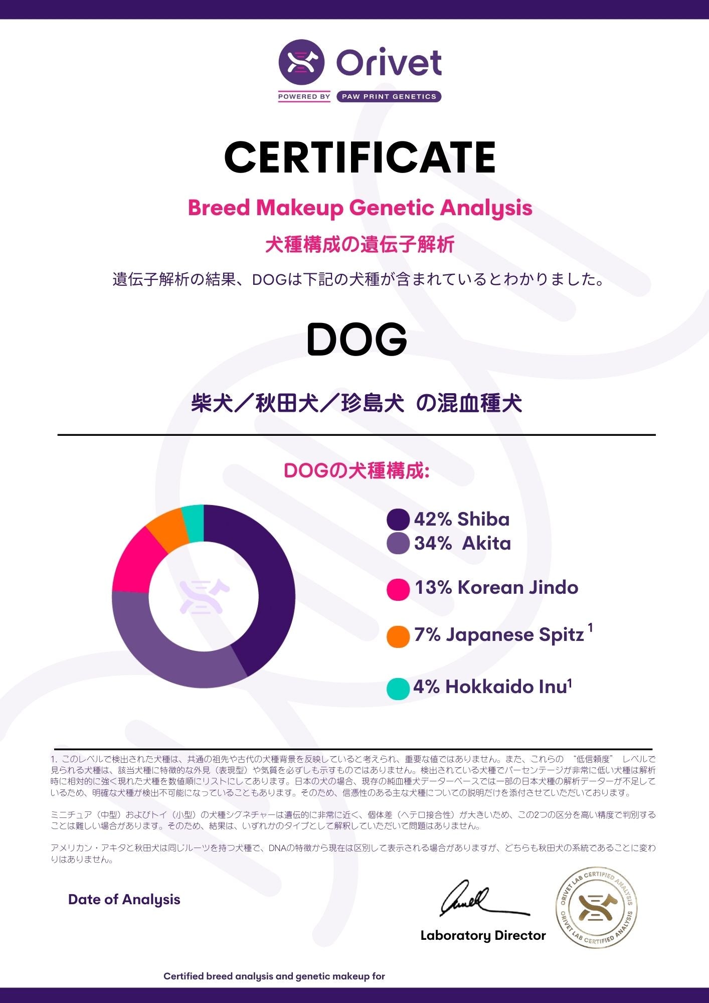 「オリベットDNA犬種鑑定®」では、DNAデータをもとに愛犬がどの犬種で構成されているのか、その割合を詳しくまとめたレポートをお届けします。